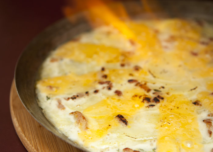 Dit is een knipoog naar de Franse klassieker Tartiflette die een populair gerecht is in met name wintersportplaatsen. Gekookte plakjes aardappel zijn als een taart opgebouwd en worden klassiek gecombineerd met spekjes, room en kaas. Vanzelfsprekend is de kaas de sprekende Reypenaer VSOP. Door de taart rijkelijk te overgieten met kirsch kan deze heel spectaculair aan tafel worden geflambeerd wat niet alleen imponerend is voor de gasten, het doet bovendien die Reypenaer mooi gratineren.